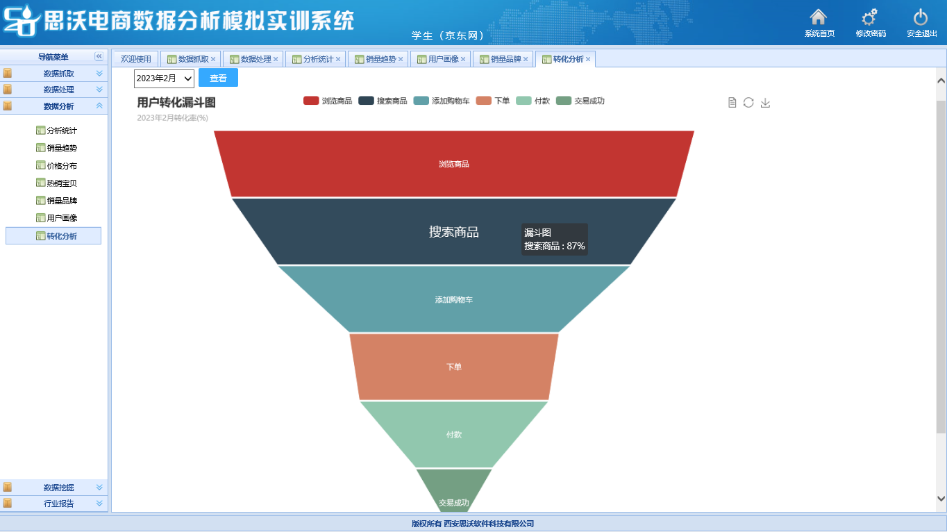 當(dang)前(qian)(qian)大數(shu)(shu)(shu)(shu)據(ju)(ju)(ju)和(he)(he)數(shu)(shu)(shu)(shu)據(ju)(ju)(ju)化運(yun)(yun)營(ying)(ying)的(de)(de)(de)概念早已深入(ru)人(ren)心(xin),數(shu)(shu)(shu)(shu)據(ju)(ju)(ju)分(fen)析(xi)(xi)(xi)已經(jing)成為(wei)電(dian)(dian)商(shang)從業人(ren)員(yuan)不可(ke)或缺(que)的(de)(de)(de)一項技(ji)能(neng)。《思(si)(si)沃電(dian)(dian)商(shang)數(shu)(shu)(shu)(shu)據(ju)(ju)(ju)分(fen)析(xi)(xi)(xi)模擬(ni)(ni)實(shi)訓(xun)系(xi)統》就(jiu)是(shi)根據(ju)(ju)(ju)當(dang)前(qian)(qian)電(dian)(dian)子商(shang)務(wu)(wu)行(xing)(xing)(xing)業發展,通過真實(shi)模擬(ni)(ni)電(dian)(dian)商(shang)運(yun)(yun)營(ying)(ying)平臺(tai)環(huan)境,幫助學(xue)(xue)生(sheng)掌握電(dian)(dian)商(shang)數(shu)(shu)(shu)(shu)據(ju)(ju)(ju)分(fen)析(xi)(xi)(xi)技(ji)能(neng)的(de)(de)(de)教學(xue)(xue)平臺(tai)軟件(jian)。隨(sui)著市場(chang)規模的(de)(de)(de)普(pu)遍(bian)增(zeng)加(jia)和(he)(he)業務(wu)(wu)規模的(de)(de)(de)快速增(zeng)長,電(dian)(dian)商(shang)業務(wu)(wu)流程開始變得(de)復雜, 涉及的(de)(de)(de)交易數(shu)(shu)(shu)(shu)據(ju)(ju)(ju)量將繼(ji)續(xu)增(zeng)加(jia)。為(wei)了在激烈的(de)(de)(de)市場(chang)競(jing)爭(zheng)中脫穎(ying)而出,許多電(dian)(dian)商(shang)公司都會(hui)設立專門(men)的(de)(de)(de)崗位和(he)(he)人(ren)員(yuan),及時(shi)了解(jie)廣(guang)告、產品(pin)價格(ge)和(he)(he)銷售數(shu)(shu)(shu)(shu)據(ju)(ju)(ju),并根據(ju)(ju)(ju)競(jing)爭(zheng)產品(pin) 的(de)(de)(de)產品(pin)和(he)(he)營(ying)(ying)銷策略(lve)進行(xing)(xing)(xing)調(diao)整(zheng)。隨(sui)著電(dian)(dian)商(shang)領域穩步增(zeng)長,競(jing)爭(zheng)日(ri)益(yi)激烈,渠道精(jing)細化運(yun)(yun)營(ying)(ying)已然(ran)成為(wei)品(pin)牌突(tu)圍的(de)(de)(de)重中之重。 數(shu)(shu)(shu)(shu)據(ju)(ju)(ju)(和(he)(he)數(shu)(shu)(shu)(shu)據(ju)(ju)(ju)分(fen)析(xi)(xi)(xi))對(dui)電(dian)(dian)商(shang)至關重要,通過海量數(shu)(shu)(shu)(shu)據(ju)(ju)(ju),店鋪(pu)運(yun)(yun)營(ying)(ying)人(ren)員(yuan)可(ke)以(yi)了解(jie)客戶的(de)(de)(de)行(xing)(xing)(xing)為(wei)和(he)(he)偏好,也可(ke)以(yi)洞察同行(xing)(xing)(xing)業競(jing)爭(zheng)對(dui)手(shou)(shou)的(de)(de)(de)方向和(he)(he)動態,這就(jiu)是(shi)了解(jie)自(zi)己(ji)、了解(jie)競(jing)爭(zheng)對(dui)手(shou)(shou)。 《思(si)(si)沃電(dian)(dian)商(shang)數(shu)(shu)(shu)(shu)據(ju)(ju)(ju)分(fen)析(xi)(xi)(xi)模擬(ni)(ni)實(shi)訓(xun)系(xi)統》高度模擬(ni)(ni)京東(dong)網(wang),真實(shi)獲取海量京東(dong)真實(shi)數(shu)(shu)(shu)(shu)據(ju)(ju)(ju),該(gai)教學(xue)(xue)軟件(jian)系(xi)統的(de)(de)(de)從京東(dong)的(de)(de)(de)各行(xing)(xing)(xing)業數(shu)(shu)(shu)(shu)據(ju)(ju)(ju)分(fen)析(xi)(xi)(xi)入(ru)手(shou)(shou),系(xi)統展示在電(dian)(dian)子商(shang)務(wu)(wu)環(huan)境下進行(xing)(xing)(xing)運(yun)(yun)營(ying)(ying)數(shu)(shu)(shu)(shu)據(ju)(ju)(ju)分(fen)析(xi)(xi)(xi)的(de)(de)(de)各種思(si)(si)路(lu)和(he)(he)方法。 能(neng)讓學(xue)(xue)生(sheng)快速學(xue)(xue)會(hui)如何做(zuo)電(dian)(dian)商(shang)數(shu)(shu)(shu)(shu)據(ju)(ju)(ju)分(fen)析(xi)(xi)(xi),并能(neng)利(li)用(yong)數(shu)(shu)(shu)(shu)據(ju)(ju)(ju)分(fen)析(xi)(xi)(xi)結果指(zhi)導(dao)網(wang)店經(jing)營(ying)(ying)。