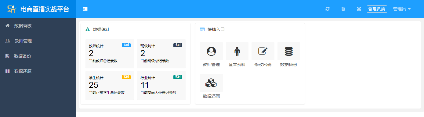 1)數據看板;教師統(tong)計、班級(ji)統(tong)計、學生統(tong)計、行業統(tong)計;