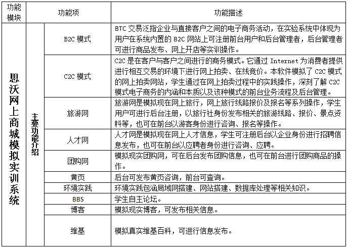 思沃(wo)網上商城模擬實(shi)(shi)訓(xun)(xun)系(xi)(xi)統(tong)(tong)充分考(kao)慮到了試驗的具體情(qing)況,系(xi)(xi)統(tong)(tong)針對(dui)網上商城模擬實(shi)(shi)訓(xun)(xun)進行(xing)(xing)相關配置(zhi),學生可在(zai)系(xi)(xi)統(tong)(tong)中體驗網上B2C、C2C模擬商城開店(dian)實(shi)(shi)訓(xun)(xun)并結合網絡環境的搭建、數據庫運用知識、團(tuan)購網、在(zai)線旅游網、在(zai)線人才網等進行(xing)(xing)多元(yuan)性的實(shi)(shi)訓(xun)(xun)系(xi)(xi)統(tong)(tong)。