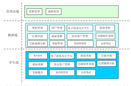 本(ben)教(jiao)(jiao)(jiao)學平臺(tai)軟件(jian)以(yi)模擬(ni)學生在行政單位中(zhong)的(de)(de)各種(zhong)業(ye)務(wu)(wu)(wu),運用(yong)信息化(hua)建(jian)設環境下的(de)(de)各種(zhong)角色、功能配(pei)置(zhi),以(yi)各業(ye)務(wu)(wu)(wu)關系和(he)流程作為主要實踐教(jiao)(jiao)(jiao)學的(de)(de)手段,配(pei)以(yi)教(jiao)(jiao)(jiao)師(shi)強大(da)的(de)(de)后臺(tai)管理功能和(he)教(jiao)(jiao)(jiao)學工具,滿足電子政務(wu)(wu)(wu)及相關學科的(de)(de)教(jiao)(jiao)(jiao)師(shi)運用(yong)現代化(hua)教(jiao)(jiao)(jiao)學工具開展網絡(luo)教(jiao)(jiao)(jiao)學和(he)實踐教(jiao)(jiao)(jiao)學的(de)(de)要求。
