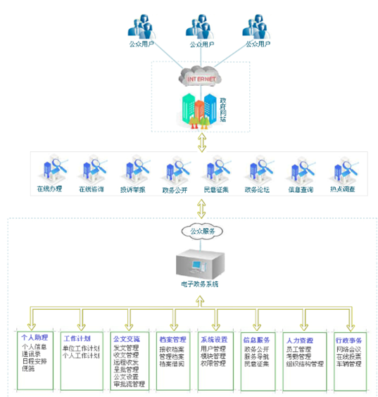 電子(zi)(zi)政(zheng)(zheng)務(wu)辦公(gong)(gong)平(ping)臺包(bao)括(kuo)電子(zi)(zi)政(zheng)(zheng)務(wu)辦公(gong)(gong)系(xi)統和電子(zi)(zi)政(zheng)(zheng)務(wu)網(wang)站兩部分,其中(zhong)電子(zi)(zi)政(zheng)(zheng)務(wu)辦公(gong)(gong)系(xi)統又包(bao)括(kuo):個人助理(li)、日常工作、公(gong)(gong)文交流(liu)、檔案管理(li)、行政(zheng)(zheng)事務(wu)、人力資(zi)源、信息服務(wu)、系(xi)統設置(zhi)八(ba)大主要功(gong)能(neng)模塊。
