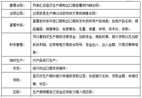 教師為參加實(shi)(shi)習的(de)(de)學(xue)生分(fen)配角色,設定實(shi)(shi)習評(ping)(ping)分(fen)標(biao)準、實(shi)(shi)時監控(kong)學(xue)生的(de)(de)操作,并且對于模擬貿易中發(fa)生的(de)(de)糾紛進(jin)行(xing)仲(zhong)裁,最終利用(yong)評(ping)(ping)分(fen)系統對學(xue)生的(de)(de)實(shi)(shi)習成(cheng)果給予評(ping)(ping)定,教師通過在網站發(fa)布新聞(wen)、調整商品成(cheng)本和價格(ge)、調整匯率(lv)、業務(wu)費用(yong)、海運(yun)費、保(bao)險費率(lv)及突(tu)發(fa)事(shi)件(jian)的(de)(de)發(fa)生概率(lv)等方式對國際貿易環境實(shi)(shi)施宏觀調控(kong),讓(rang)學(xue)生在實(shi)(shi)習中充分(fen)發(fa)揮主觀能動性