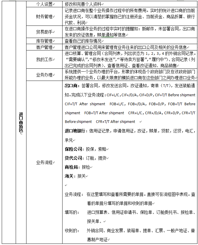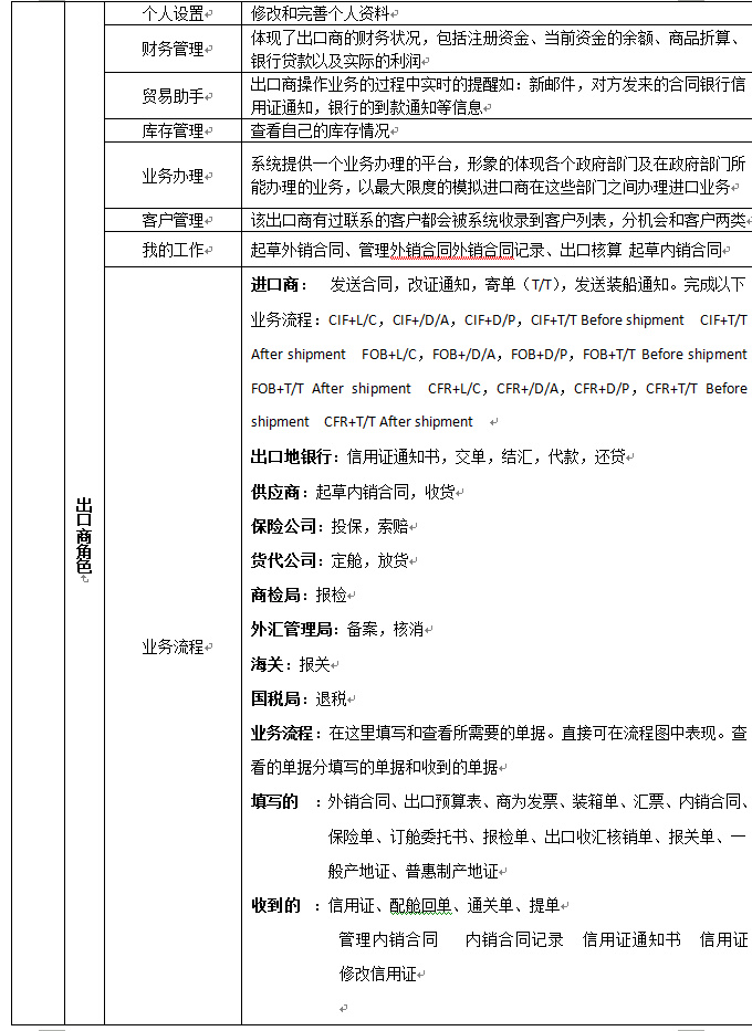 7、可以配置進(jin)(jin)口(kou)(kou)商(shang)、出(chu)口(kou)(kou)商(shang)、進(jin)(jin)口(kou)(kou)地銀(yin)行(xing)(xing)、出(chu)口(kou)(kou)地銀(yin)行(xing)(xing)、國(guo)稅局(ju)、海(hai)關、商(shang)檢(jian)局(ju)、保險(xian)公(gong)(gong)司、貨代(dai)公(gong)(gong)司、外匯管(guan)理局(ju)等相關參數(shu)和業務,在實訓過程中可以分(fen)組、分(fen)角色(se)進(jin)(jin)行(xing)(xing)互(hu)動、交互(hu)式訓練。角色(se)扮演:出(chu)口(kou)(kou)商(shang)、進(jin)(jin)口(kou)(kou)商(shang)、生產(chan)商(shang)(工廠)、進(jin)(jin)口(kou)(kou)銀(yin)行(xing)(xing)、出(chu)口(kou)(kou)銀(yin)行(xing)(xing)、保險(xian)公(gong)(gong)司、商(shang)檢(jian)局(ju)、海(hai)關、外匯管(guan)理局(ju)、貨代(dai)、國(guo)稅局(ju)