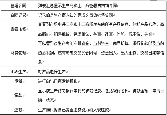 教(jiao)師(shi)為參加實(shi)習(xi)(xi)的學(xue)生(sheng)分(fen)配角色(se),設(she)定(ding)實(shi)習(xi)(xi)評(ping)分(fen)標準、實(shi)時監控(kong)學(xue)生(sheng)的操作,并且(qie)對于模擬(ni)貿(mao)易中發生(sheng)的糾紛進(jin)行仲(zhong)裁(cai),最終(zhong)利用評(ping)分(fen)系統(tong)對學(xue)生(sheng)的實(shi)習(xi)(xi)成(cheng)果給予評(ping)定(ding),教(jiao)師(shi)通過在網站發布新(xin)聞、調(diao)整商品成(cheng)本和價(jia)格、調(diao)整匯率(lv)(lv)、業(ye)務費用、海運費、保險費率(lv)(lv)及突發事(shi)件的發生(sheng)概率(lv)(lv)等方式對國際貿(mao)易環境(jing)實(shi)施宏觀(guan)調(diao)控(kong),讓(rang)學(xue)生(sheng)在實(shi)習(xi)(xi)中充分(fen)發揮主觀(guan)能(neng)動(dong)性