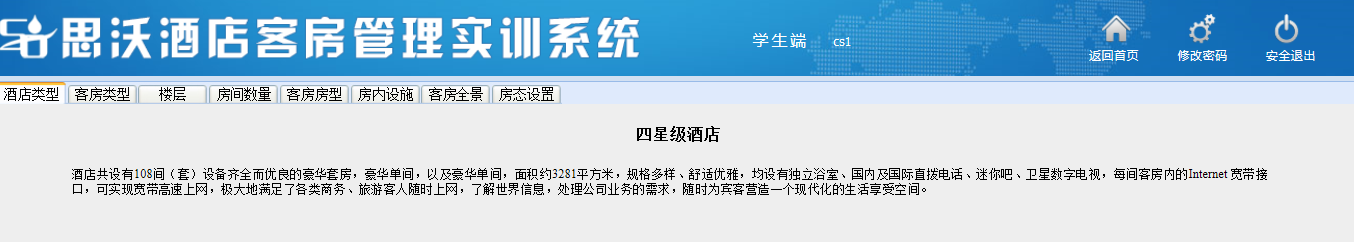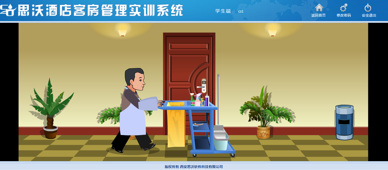 思(si)沃酒店(dian)客(ke)房(fang)(fang)(fang)(fang)管理(li)模(mo)擬(ni)實訓系統以flash動畫模(mo)擬(ni)酒店(dian)情景,學(xue)生進(jin)入進(jin)行模(mo)擬(ni)客(ke)房(fang)(fang)(fang)(fang)管理(li)日(ri)常事務(wu)處理(li),包(bao)括客(ke)房(fang)(fang)(fang)(fang)設計、引領入住、客(ke)房(fang)(fang)(fang)(fang)查房(fang)(fang)(fang)(fang)、客(ke)房(fang)(fang)(fang)(fang)整理(li)、布草間等(deng)類型實訓。