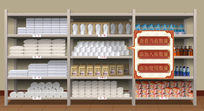 學生模擬工作人員通過(guo)動畫場景(jing)互動對布(bu)草間(jian)進(jin)行管(guan)理(li)操(cao)作。并可(ke)查看床(chuang)單、被罩、枕套、浴(yu)巾(jin)、毛巾(jin)、洗漱包、洗發水等消耗物品(pin)的庫存數量,并判斷是否補(bu)充(chong)。