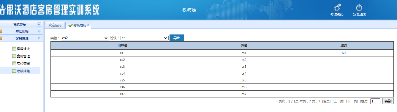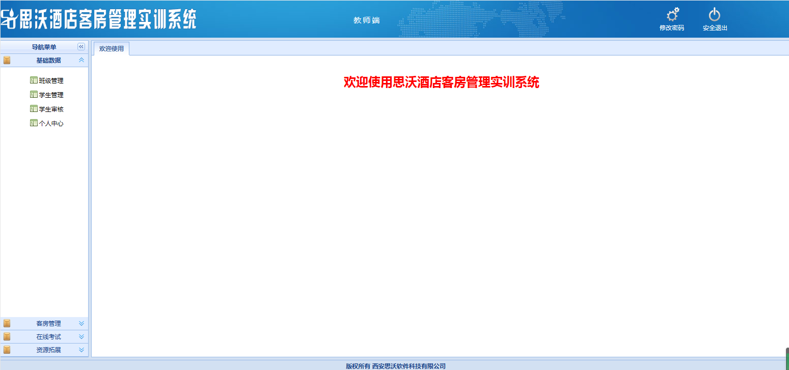 教師(shi)登陸(lu)界面:基礎數據(ju)、客房管理,在(zai)線(xian)考(kao)試(shi),資源拓(tuo)展(zhan)每個大(da)模塊(kuai)下分別有相應的子模塊(kuai)。