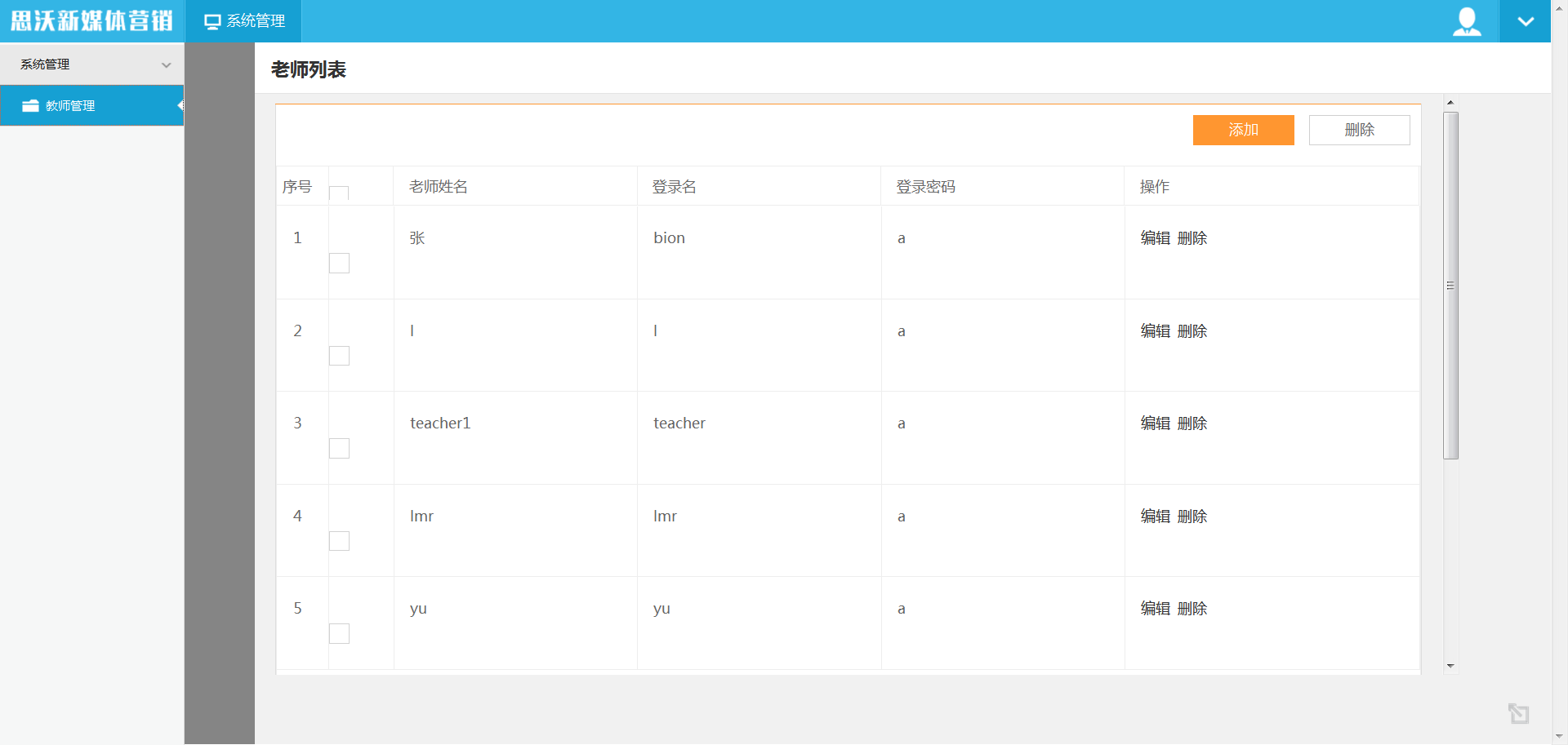 管理員端包含教師管理模塊,可對教師用戶進行管理操作(添加、編輯、刪除)。