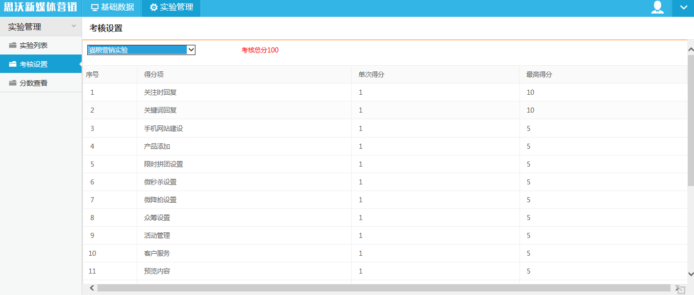 教師端模塊可進行自動得分分值設置,系統提供關注時回復、關鍵詞回復、手機網站建設、產品添加、限時拼團設置、微秒殺設置、微降拍設置、眾籌設置、活動管理、客戶服務、預覽內容、微博轉發、微博評論、名人堂關注、社群構建、社群軟文管理、社群問卷管理、社群海報管理,可設置單次操作得分及操作類型最高得分。