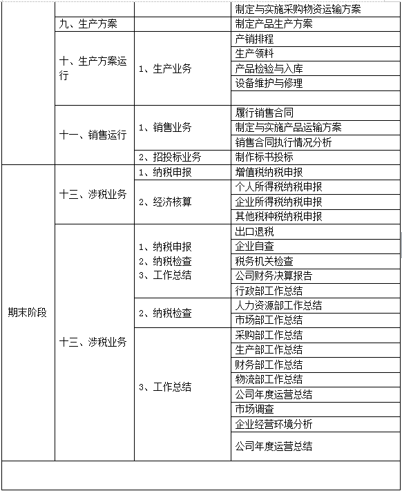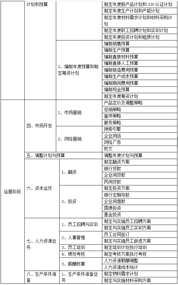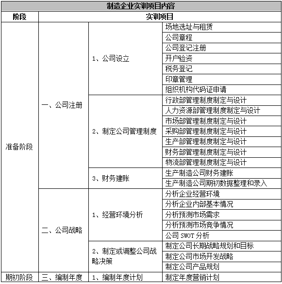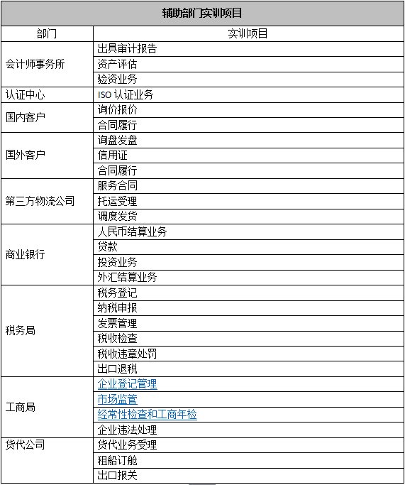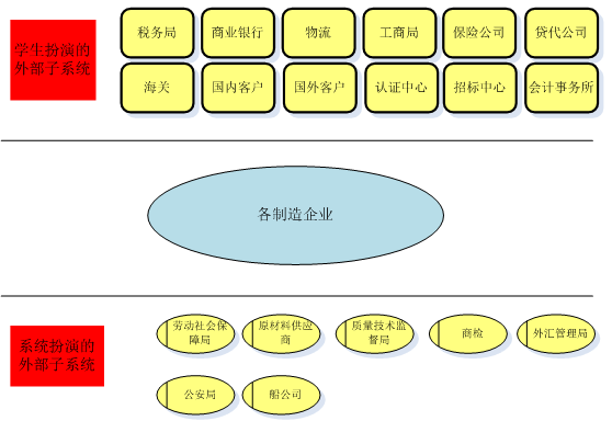 跨專業(ye)平(ping)(ping)臺(tai)主要由搭建(jian)平(ping)(ping)臺(tai)運行(xing)(xing)(xing)環境、制(zhi)造企(qi)業(ye)運營、行(xing)(xing)(xing)政(zheng)業(ye)務(wu)和(he)金融(rong)業(ye)務(wu)等幾大部(bu)(bu)(bu)(bu)(bu)(bu)(bu)分(fen)組成。以現代制(zhi)造行(xing)(xing)(xing)業(ye)為藍本,設置總經(jing)理辦(ban)公(gong)室、銷售部(bu)(bu)(bu)(bu)(bu)(bu)(bu)、生產部(bu)(bu)(bu)(bu)(bu)(bu)(bu)、采購(gou)部(bu)(bu)(bu)(bu)(bu)(bu)(bu)、倉儲部(bu)(bu)(bu)(bu)(bu)(bu)(bu)、外貿部(bu)(bu)(bu)(bu)(bu)(bu)(bu)、市場(chang)部(bu)(bu)(bu)(bu)(bu)(bu)(bu)、財務(wu)部(bu)(bu)(bu)(bu)(bu)(bu)(bu)、人才資(zi)(zi)源部(bu)(bu)(bu)(bu)(bu)(bu)(bu)、企(qi)業(ye)投(tou)資(zi)(zi)融(rong)部(bu)(bu)(bu)(bu)(bu)(bu)(bu)等十(shi)大制(zhi)造企(qi)業(ye)職能部(bu)(bu)(bu)(bu)(bu)(bu)(bu)門(men);真實模(mo)擬行(xing)(xing)(xing)政(zheng)辦(ban)事(shi)部(bu)(bu)(bu)(bu)(bu)(bu)(bu)門(men),提供(gong)工商(shang)局(ju)、稅(shui)務(wu)局(ju)、會計(ji)事(shi)務(wu)所、銀行(xing)(xing)(xing)、物流、保(bao)險公(gong)司(si)、貸代公(gong)司(si)等辦(ban)事(shi)場(chang)所;系統虛擬扮演公(gong)安局(ju)、質量(liang)與技術(shu)監(jian)督局(ju)、勞動與社會保(bao)障局(ju)、原材料供(gong)應(ying)商(shang)、海(hai)關(guan)(guan)、商(shang)檢、外匯管(guan)理局(ju)、船公(gong)司(si)等服(fu)務(wu)性部(bu)(bu)(bu)(bu)(bu)(bu)(bu)門(men)行(xing)(xing)(xing)業(ye)。攘括了與制(zhi)造行(xing)(xing)(xing)業(ye)有關(guan)(guan)的所有相關(guan)(guan)行(xing)(xing)(xing)政(zheng)辦(ban)事(shi)部(bu)(bu)(bu)(bu)(bu)(bu)(bu)門(men)和(he)服(fu)務(wu)性行(xing)(xing)(xing)業(ye)。