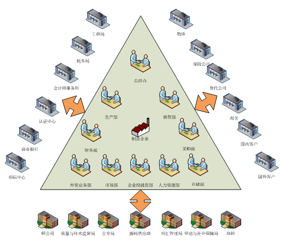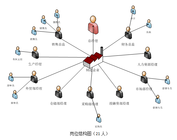 核(he)心系統指的是制造企業(ye)內(nei)部(bu)(bu)(bu)經營和管(guan)理系統,由總(zong)經理辦公室、銷售部(bu)(bu)(bu)、生(sheng)產部(bu)(bu)(bu)、采購部(bu)(bu)(bu)、倉(cang)儲部(bu)(bu)(bu)、外貿(mao)部(bu)(bu)(bu)、市場(chang)部(bu)(bu)(bu)、財務(wu)部(bu)(bu)(bu)、人才資源部(bu)(bu)(bu)、企業(ye)投(tou)資融資部(bu)(bu)(bu)等部(bu)(bu)(bu)門構成,下(xia)設(she)21個崗位(wei),各施(shi)其(qi)職,來完成企業(ye)的運作。