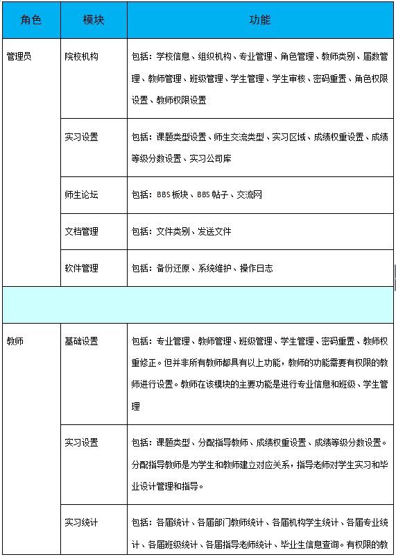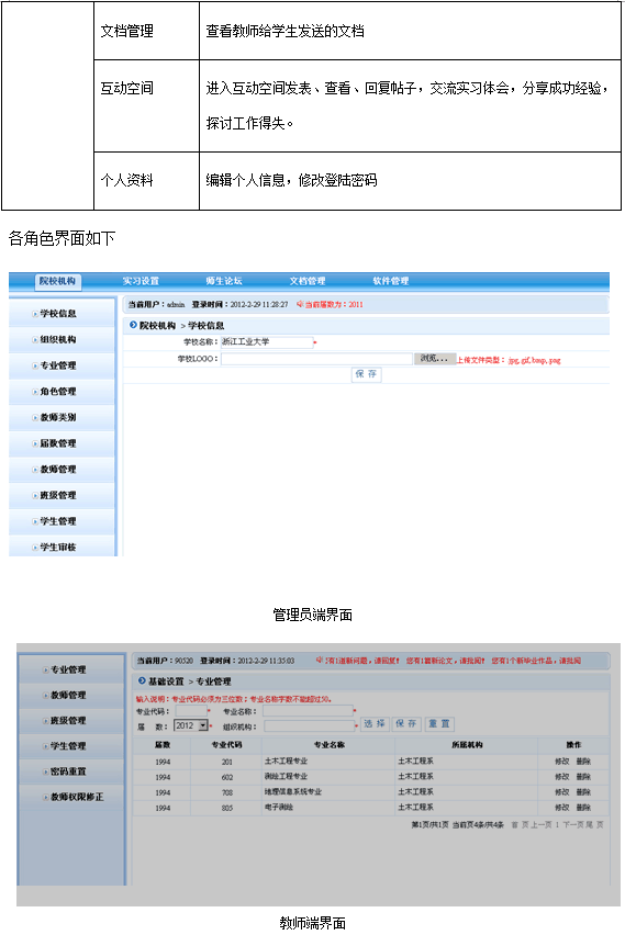 軟(ruan)件按(an)管(guan)理(li)(li)(li)員、教(jiao)(jiao)師(shi)(shi)(shi)、學(xue)生分為三種用戶權(quan)限(xian)(xian)。其(qi)中,管(guan)理(li)(li)(li)員設(she)置(zhi)軟(ruan)件基礎信息,包(bao)括:學(xue)校信息、院校組織機構、屆數年份管(guan)理(li)(li)(li)、教(jiao)(jiao)師(shi)(shi)(shi)類(lei)別、權(quan)限(xian)(xian)管(guan)理(li)(li)(li)等(deng)。教(jiao)(jiao)師(shi)(shi)(shi)根據權(quan)限(xian)(xian)不(bu)同,功(gong)能模(mo)塊不(bu)同,只有(you)開通了權(quan)限(xian)(xian)的教(jiao)(jiao)師(shi)(shi)(shi)可(ke)操作相應的功(gong)能。教(jiao)(jiao)師(shi)(shi)(shi)角色(se)的主要模(mo)塊包(bao)括:系統(tong)設(she)置(zhi)、統(tong)計(ji)查看(kan)、畢(bi)業(ye)實(shi)(shi)習(xi)、畢(bi)業(ye)設(she)計(ji)、成績(ji)管(guan)理(li)(li)(li)、輔助工具。學(xue)生在實(shi)(shi)習(xi)期(qi)間,應按(an)時填寫周記,完成教(jiao)(jiao)師(shi)(shi)(shi)的作業(ye),在有(you)疑問(wen)時還可(ke)以向教(jiao)(jiao)師(shi)(shi)(shi)提問(wen)。學(xue)生端的主要模(mo)塊有(you):畢(bi)業(ye)實(shi)(shi)習(xi)匯總、畢(bi)業(ye)實(shi)(shi)習(xi)、畢(bi)業(ye)設(she)計(ji)、成績(ji)查看(kan)、輔助工具