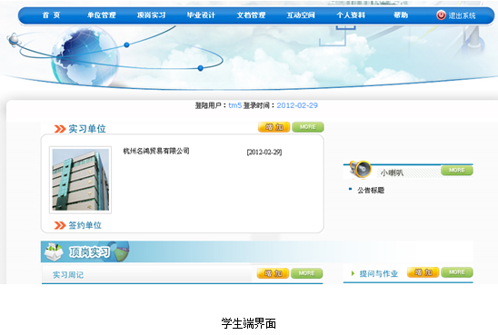 便于(yu)教師的優質資源共(gong)享,加(jia)深教師之間(jian)合(he)作(zuo)(zuo)。學生(sheng)的問題(ti)及時得以解決,分享經驗,探討得失(shi)。學生(sheng)可以提交實習單位的工作(zuo)(zuo)介紹以及簽約單位,供教師查閱。